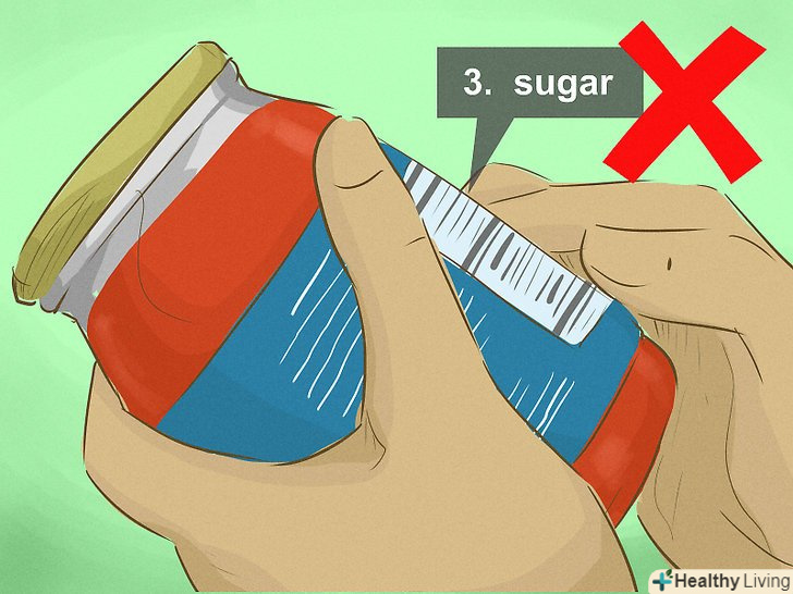 Тримайтеся подалі від продуктів, де цукор вказаний серед перших трьох позицій в переліку інгредієнтів. інгредієнти на маркуванні харчової цінності перераховуються в спадному порядку на підставі того, яка кількість кожного компонента міститься в продукті. Якщо ви виявите цукор (або будь-які його альтернативні назви) серед перших трьох пунктів, значить, вміст цукру дуже висока. А якщо на маркуванні харчової цінності вказано більше одного виду цукру, вам слід уникати цього продукту за всяку ціну.- Насторожено ставитеся до продуктів, що видають себе за "натуральні" або "органічні" замінники цукру. У цих підсолоджувачах все ще містяться калорії, і при цьому вони не додадуть ніяких поживних речовин в ваш раціон.