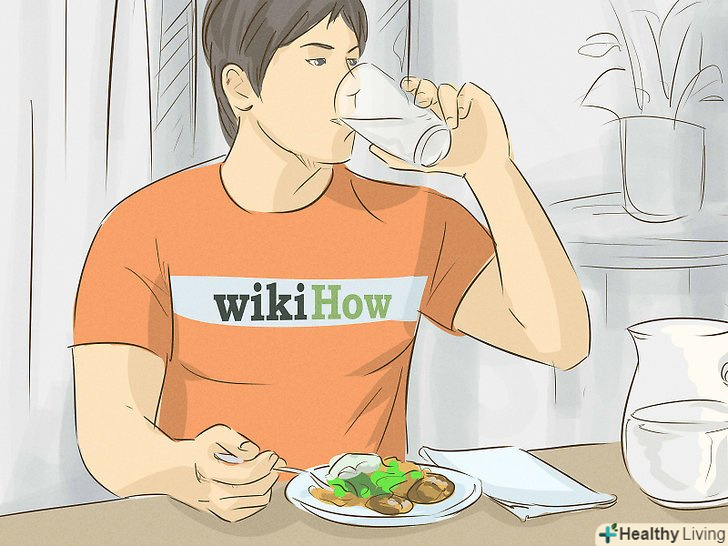 Пийте воду з кожним прийомом їжі. випивайте склянку води під час кожного прийому їжі. Це допомагає травленню: поживні речовини розчиняються в рідині, і організму стає легше їх засвоїти. Крім того, вода пом'якшує стілець і запобігає запори. [2] не забувайте пити воду, коли перекушуєте протягом дня.- Якщо ви хочете схуднути, пийте воду перед прийомом їжі, це допомагає швидше досягти почуття насичення.
