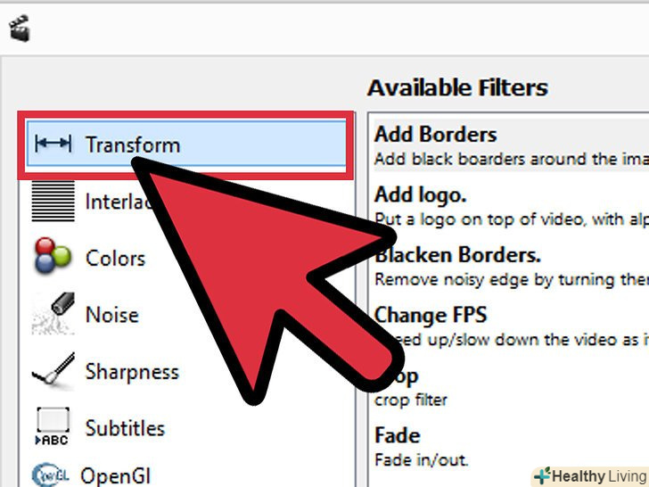 Змініть своє відео.Категорія фільтрів "Transform" дозволить вам налаштувати параметри відображення відео. З їх допомогою ви можете додати рамку, логотип і багато іншого.- Щоб змінити розміри відео, використовуйте фільтр "swsResize", що дозволяє вручну налаштувати дозвіл. Ви можете змінювати його за допомогою відсотків або пікселів.[3]