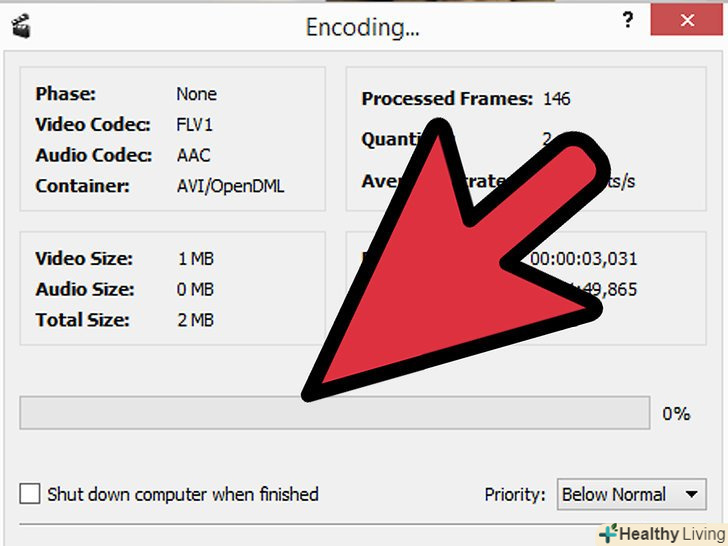 Дочекайтеся завершення кодування. після того, як ви натиснули "Save", Avidemux починає Кодування відео відповідно до вибраних Вами налаштувань. Залежно від обсягу установок, тривалість цього процесу може істотно варіюватися. Коли процес буде завершено, відкрийте готове відео в медіаплеєрі і перегляньте результат своєї роботи.