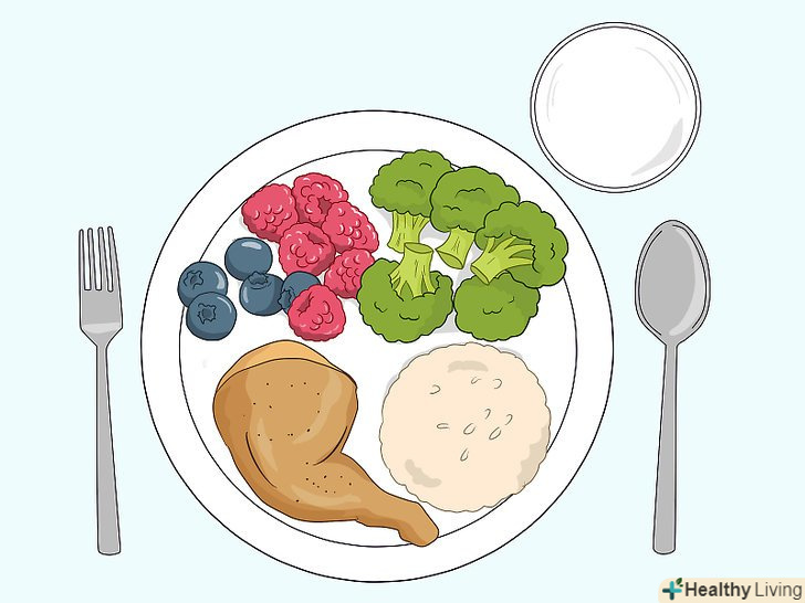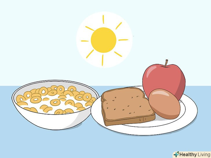Почніть свій день зі здорового сніданку.найкраще, що ви можете зробити для скидання ваги — це почати день зі збалансованого і здорового сніданку. Хороший сніданок дозволяє запустити травні процеси, які спалюють калорії протягом усього дня. Він також дає відчуття ситості надовго, що знижує тенденцію до перекусів вранці і в полуденний час, відповідно, перешкоджає надмірному споживанню калорій.- Спробуйте комбінацію з цільнозернових круп і хлібців, їжте яйця, багаті білком, і фрукти, в яких повно вітамінів. Все це може скласти прекрасно збалансований сніданок. Якщо ви поспішаєте, Зробіть собіфруктовий коктейль і з'їжте цільнозерновий батончик, це зручно і в той же час ситно.