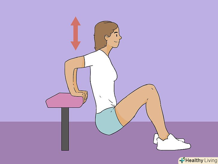 Нарощуйте м'язи грудей і плечей.підкреслюючи верхню частину тіла, ви тим самим візуально зменшите свою талію, так що варто включити вправи на опрацювання м'язів грудей і плечей в свою програму тренувань. Ось кілька вправ, які варто спробувати:- Згинання рук на лаві. Цю вправу тренує руки і плечі, для його виконання потрібна лавка або лава. Сядьте на край лави, ноги прямо перед собою. Міцно тримайтеся за край лави руками і повільно опустіть тулуб майже до підлоги. Тримайте спину рівно, опускайтеся, поки кут рук в ліктях не буде дорівнює 90 градусам. Потім поверніться у вихідне положення і повторіть знову.