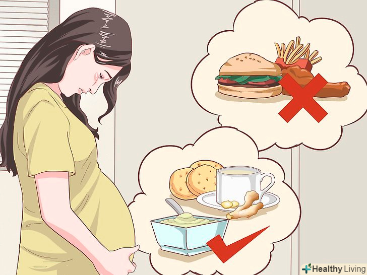 Споживайте достатню кількість калорій під час вагітності. вам може бути важко споживати достатню кількість здорових калорій, якщо ви зіткнулися з нудотою або блювотою на ранніх стадіях вагітності. На жаль, якщо ви не наберете достатню вагу, це підвищить ризик виникнення ускладнень під час вагітності.[12] щоб поліпшити свій апетит, їжте невеликими порціями і уникайте гострих, жирних продуктів. Можливо, вам було б корисно деякий час харчуватися м'якими продуктами, особливо якщо ви чутливі до запаху їжі. Щоб впоратися з ранковою нудотою, перекусіть наступними продуктами:[13]- Крекери або кренделі