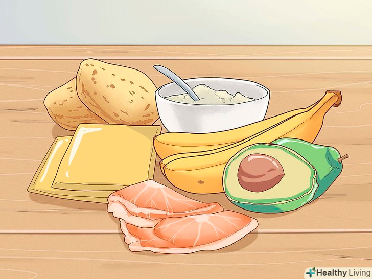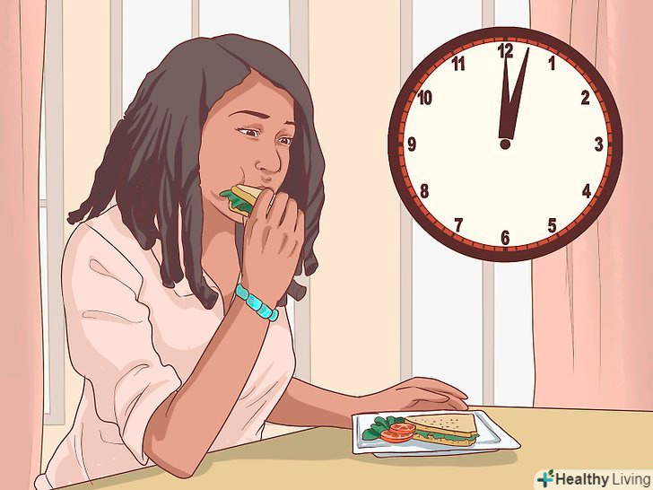 Їжте регулярно.плануйте їсти в призначений час дня. Це не дасть вам пропустити прийом їжі і допоможе визначити, скільки калорій включити в кожен з них. Поекспериментуйте зі своїм графіком – визначте, чи хочете ви їсти великими порціями за раз або розділити прийоми їжі на кілька.- Діти люблять слідувати певному розпорядку і знати, чого їм варто чекати. Пропонуйте своїм маленьким дітям перекушування і прийоми їжі в один і той же час кожен день. Крім того, вони будуть більш схильні їсти, якщо ви дозволите їм самостійно прийняти якісь рішення з приводу їжі.[14]