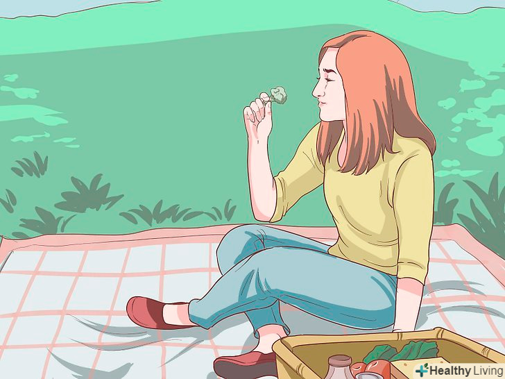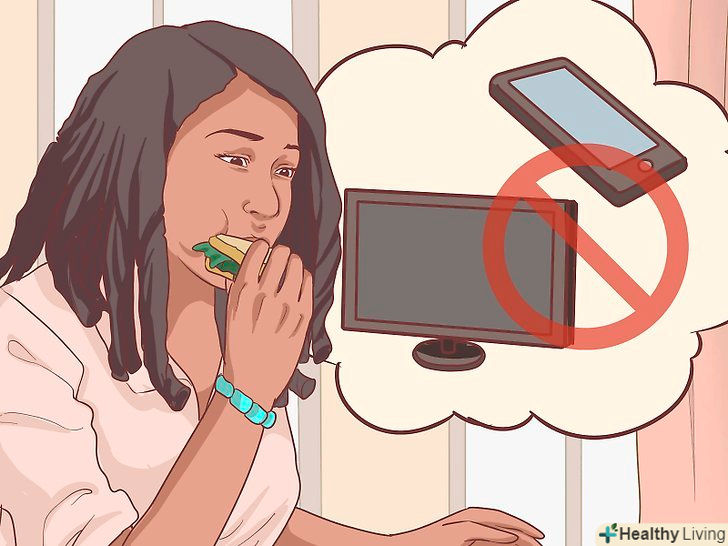 Зосередьтеся на їжі.якщо ви постійно зайняті протягом дня, кудись поспішаєте і забуваєте поїсти, вам може бути важко харчуватися корисними продуктами або споживати достатню кількість калорій. Обов'язково потрібно пригальмувати, присісти і насолодитися своєю їжею. Створіть спокійну атмосферу, де ви зможете розслабитися і з нетерпінням чекати прийому їжі.[15]- Уникайте відволікань. Не варто, наприклад, дивитися телевізор або розмовляти по телефону під час їжі.