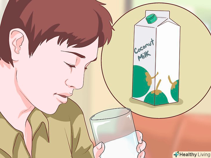 Пийте висококалорійні напої.якщо ви занадто зайняті, щоб перекушувати або сісти і нормально поїсти, спробуйте пити висококалорійні напої, такі як Протеїнові коктейлі і смузі. Це обов'язково повинні бути здорові напої, які містять поживні речовини, а не тільки кофеїн і цукор.[2]- Спробуйте використовувати кокосове молоко для приготування своїх напоїв. Кокосове молоко містить здорові жири з високим вмістом калорій. Якщо хочете використовувати менш калорійний продукт, виберіть мигдальне або конопляне молоко.