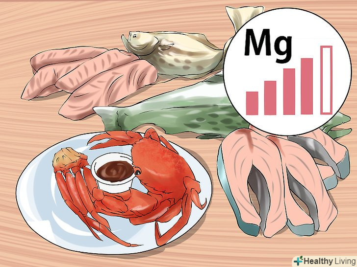 Включіть в свій раціон морепродукти.у багатьох морепродуктах міститься велика кількість магнію. Однак слід дотримуватися помірності, оскільки в риб'ячому м'ясі накопичуються важкі метали (наприклад, ртуть) та інші забруднюючі речовини.[6] вживайте не більше 340 грамів морепродуктів на тиждень.[7] велика кількість магнію міститься в наступних морепродуктах:- Сніговий краб (приготований, 70 г) — 47 мг
