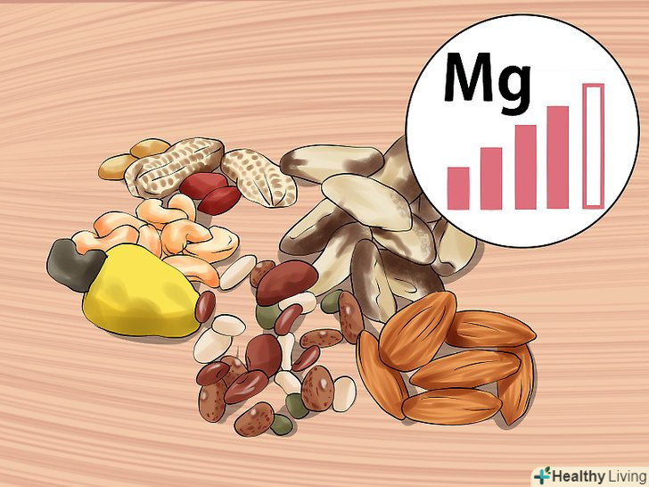 Перекушуйте горіхами, насінням і бобовими.у цих продуктах міститься чимала кількість магнію. Їх можна використовувати як в якості легкої закуски, так і у вигляді гарніру до основних страв. Багато магнію міститься в наступних продуктах:- Мигдаль (засмажений без масла, 28 г) - 80 мг[9]