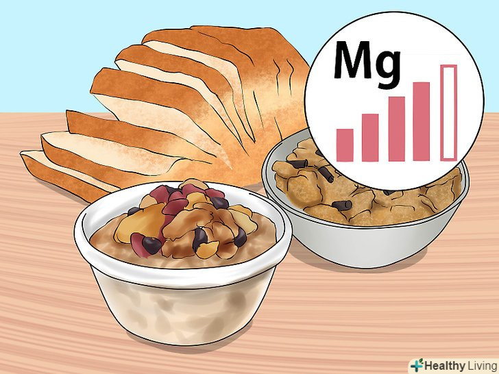 Включіть в свій раціон зернові продукти.у деяких з них також міститься чимало магнію. Завжди вивчайте склад продукту і дотримуйтеся рекомендованої дозування. Велика кількість магнію міститься в наступних продуктах:- Всі види висівок — 30 грамів) - 94-111 мг[11]