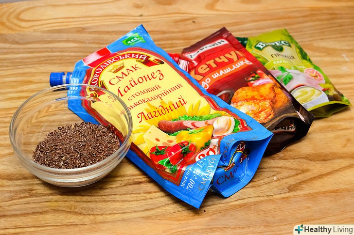 Додайте лляне насіння до найбільш часто використовуваних приправ.лляне насіння можна додавати в майонез, гірчицю і кетчуп. Лляне насіння також можна використовувати в заправках для салатів. Для цієї мети вам не потрібно додавати дуже багато насіння ( не більше 1 столової ложки).
