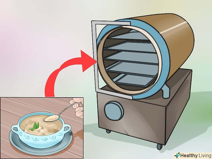 Зневоднюйте продукти.хоча при сушінні продуктів на сонці або в духовці вони втрачають більше вітамінів, ніж при заморожуванні, все ж цей процес менш руйнівний, ніж процес консервування. Зневоднення виморожуванням з подальшою сублімацією льоду-метод, який часто використовується для трав і супів і зберігає ще більше поживної цінності.[22]
