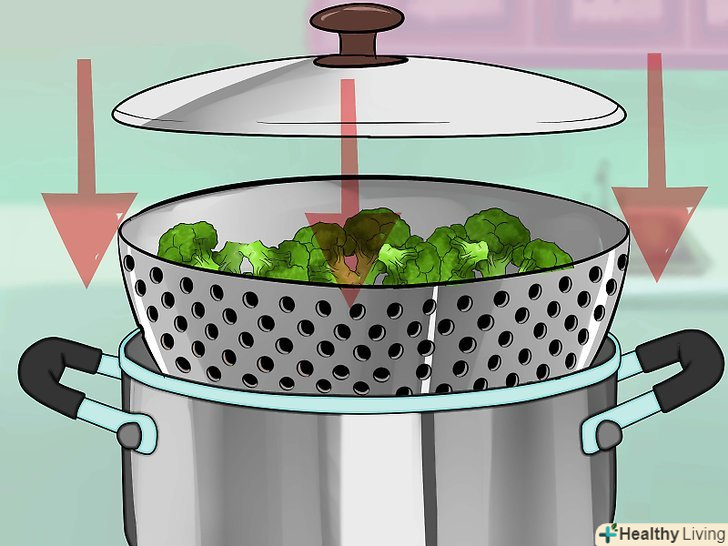 Готуйте на пару, коли це можливо. [11] якщо ви варите овочі або готуєте їх у великій кількості жиру (наприклад, у фритюрі), це може позбавити їх цінних вітамінів. Розчинні у воді вітаміни, такі як в і С, вимиються при кипінні, а жиророзчинні вітаміни, такі як вітамін А, підуть при обсмажуванні в рослинне масло. Краще готувати овочі на пару, використовуючи невелику кількість води, на плиті або в мікрохвильовій печі. Можна також пасерувати овочі в невеликій кількості жиру, який стане частиною самого блюда.[12]- Якщо ви використовуєте безпечні для мікрохвильовки ємності, то приготування їжі в мікрохвильовій печі впливає на вміст поживних речовин не більше, ніж будь-який інший метод готування.[13]