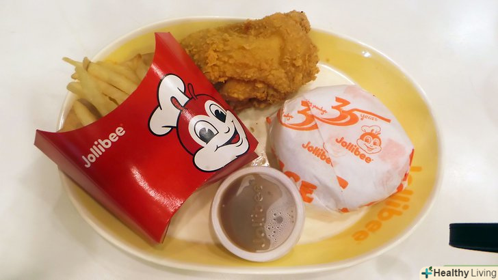 Утримайтеся від фастфуду.ми всі знаємо, що фастфуд "шкідливий" для нашого здоров'я. І тим не менш, він залишається головним елементом щотижневого раціону занадто багатьох людей. По-перше фастфуд це часто Смажена їжа, яка до того ж ще й пересолена. Додайте солодкі напої і фрі-картоплю, і Ваш обід легко перевищить норму калорійності вашої їжі за весь день. І на довершення всього жири, що містяться в фастфуді - це, як правило, транс жири, найшкідливіші з усіх можливих.[15]