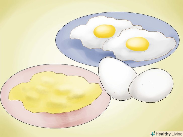 Не варто зовсім відмовлятися від жовтків.яєчний білок містить менше калорій і жирів, але необхідно відзначити, що жовток теж містить дуже цінні поживні компоненти. Зокрема, ці поживні речовини допомагають запустити метаболізм і можуть навіть змусити організм використовувати жир, а не відкладати його.[12]- Хорошим варіантом омлету буде одне ціле яйце і один-два яєчних білка.