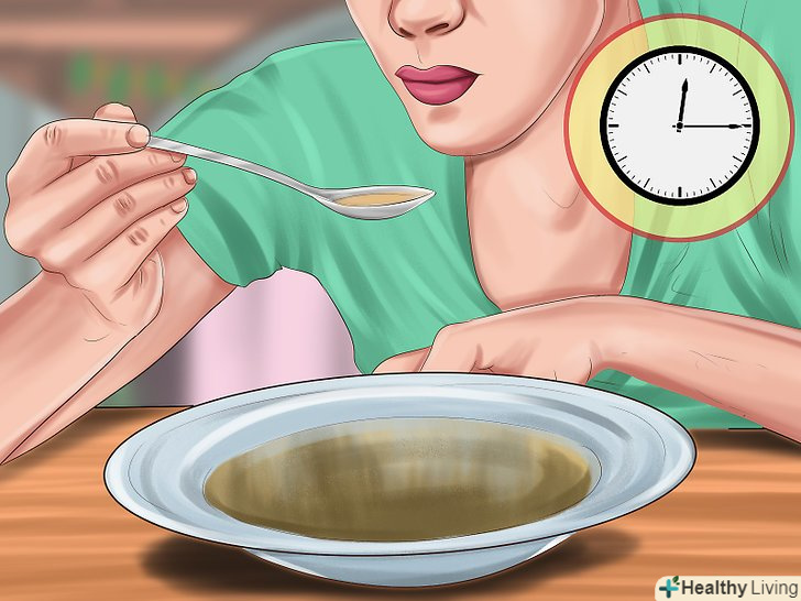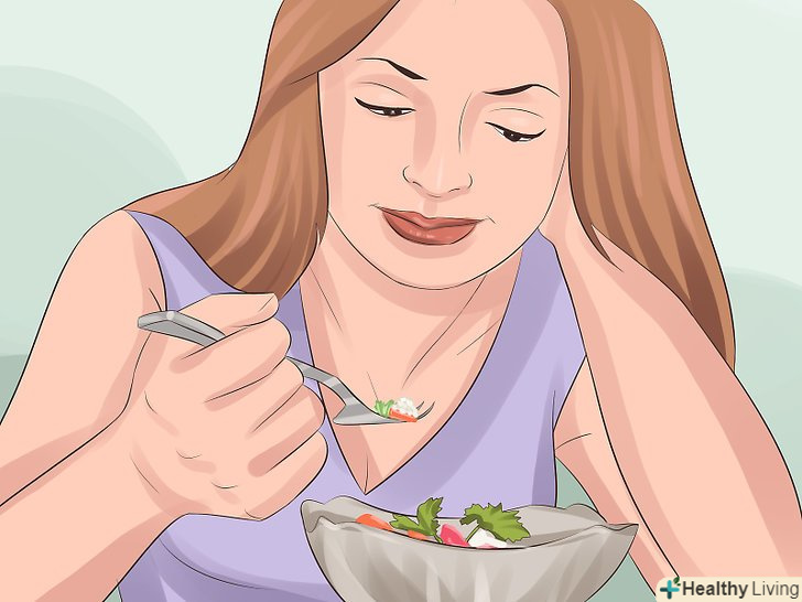 Їжте невеликими порціями, але часто.харчування маленькими порціями сприятливо позначиться на вашому животі — і талії — так що постарайтеся їсти невеликими порціями 4-5 разів на день замість 3 щільних прийомів їжі. Ваш метаболізм буде працювати як годинник, ви ніколи не будете настільки голодні, щоб з'їсти занадто багато, і їжа буде краще засвоюватися.- Переїдання може призвести до здуття, так що їжте потроху.[10]