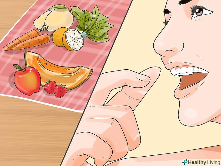 Вживайте фрукти і овочі з кожним прийомом їжі.якщо ви хочете схуднути, фрукти та овочі повинні бути основними продуктами у вашому меню. Поставте перед собою мету включати фрукти і овочі в кожен прийом їжі.- Фрукти і овочі відрізняються високим вмістом клітковини і низькою калорійністю. Свіжі овочі та фрукти допомагають впоратися з почуттям голоду. Завдяки цьому ви зможете відмовитися від калорійних перекусів.[8]