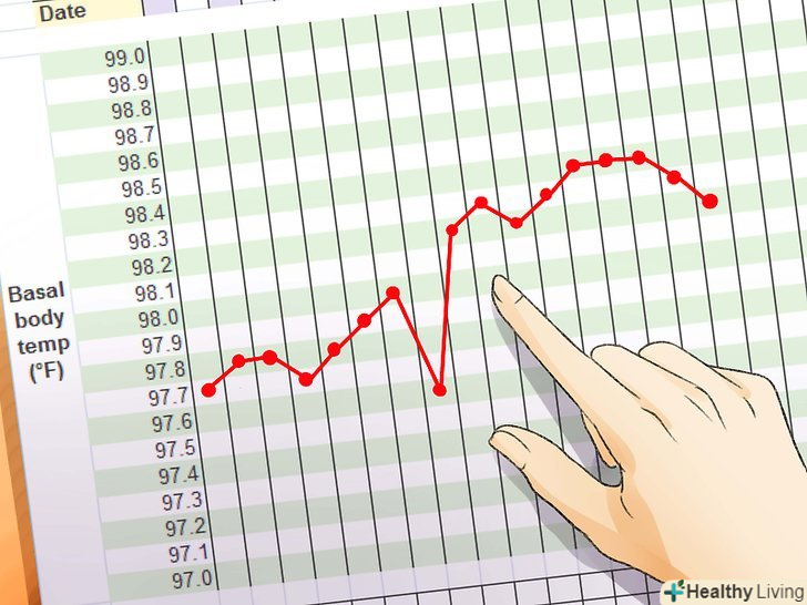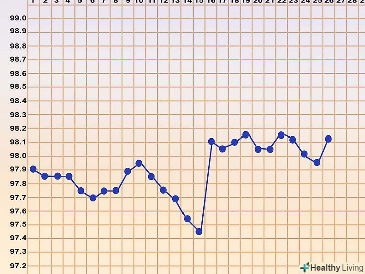 Почніть вимірювати базальну температуру тіла.при симптоматотермальном методі використовується поєднання аналізу фізичних змін і базальної температури.[20] вимірювання температури-важлива частина цього методу, і робити це потрібно щодня.[21]- Оскільки базальна температура підвищується на 2-3 дні після овуляції, її вимір дозволить вам зрозуміти, в який час циклу у вас настає овуляція. (Вище про це розповідалося докладніше.)