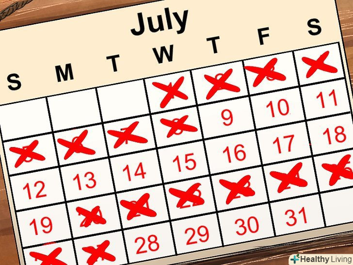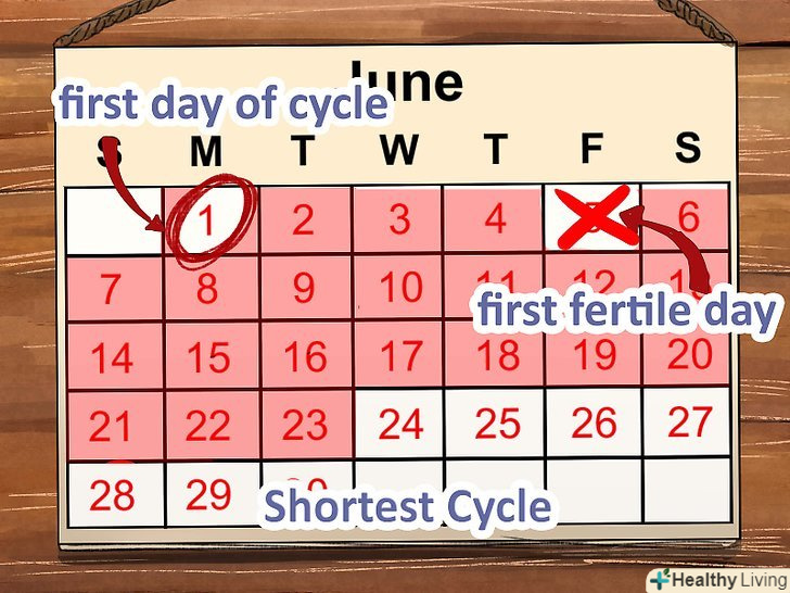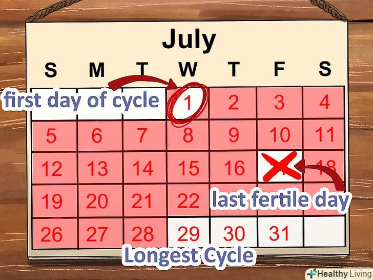Розберіться в своєму циклі.при календарному методі розраховується кількість днів між циклами, і на основі цих даних робиться припущення про фертильні дні. [28]- У більшості жінок з регулярними менструаціями цикл становить 26-32 дні, хоча він може бути коротшим (аж до 23 днів) або довшим (до 35 днів).[29] цикли можуть бути різними, і це нормально. Першим днем циклу вважається початок менструації, а останнім - останній день наступної менструації.