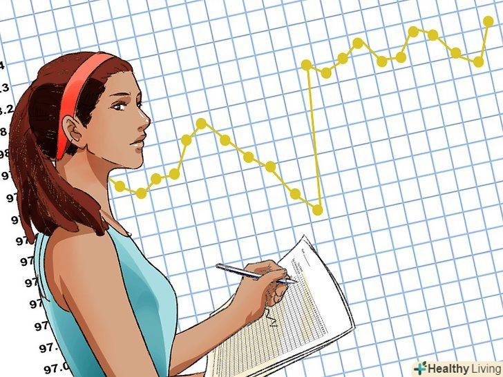 Вимірюйте і записуйте базальну температуру щодня протягом декількох місяців.щоб показання були точними, робити це слід в один і той же час щодня - відразу після пробудження і до того, як встати.[3]- Тримайте термометр біля ліжка. Намагайтеся прокидатися і вимірювати температуру в один і той же час кожен день.