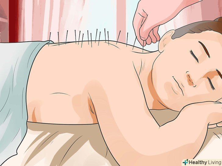 Сходіть на сеансГолковколювання.існує думка, що голковколювання допомагає викликати овуляцію, оскільки воно знижує рівень фолікулостимулюючого гормону (ФСГ), в разі якщо він високий.[9] наприклад, при синдромі полікістозних яєчників (СПКЯ), рівень ФСГ може бути занадто високим, що впливає на менструальний цикл і на овуляцію.[10]- Не хвилюйтеся: голки, що використовуються при голковколюванні, дуже тонкі, і більшість людей не знаходять цю процедуру болючою.
