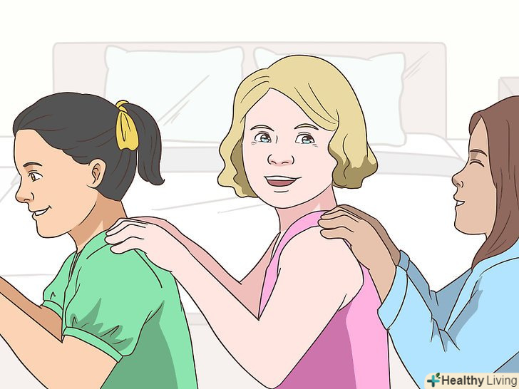 Щоб допомогти дочці позбутися спазмів, запропонуйте їй масаж.якщо ви разом вирішили організувати вечірку для кількох її подруг, навряд чи їм захочеться масажувати один одному поперек і живіт. Але на дівич-вечорі подруги можуть зробити один одному масаж шиї — це розслабить напружені м'язи і допоможе зменшити дискомфорт, викликаний спазмами.[13]- Якщо ви з дочкою вирішили провести тихий затишний вечір удвох, можете поговорити про те, як ще можна впоратися з вагою і спазмами під час менструації. Наприклад, покажіть, як потрібно масажувати живіт, або дайте доньці грілку.