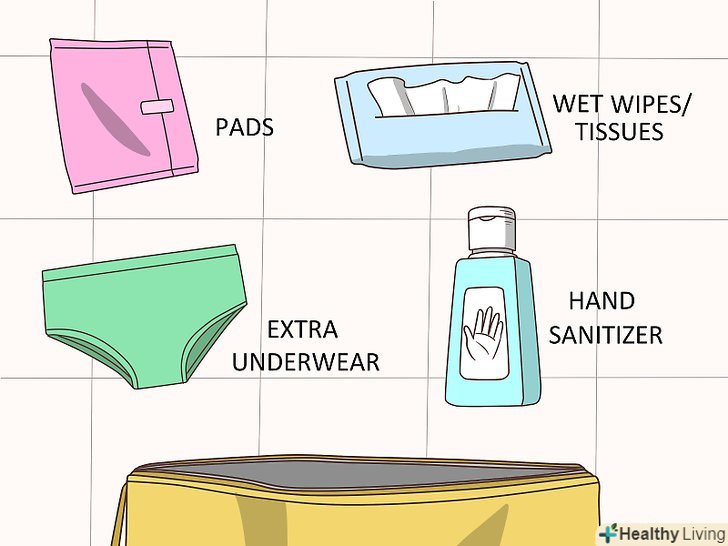 Заздалегідь підготуйте необхідні гігієнічні приналежності.у більшості дівчаток перший менструальний цикл починається у віці 12-13 років, але бувають винятки: у деяких дівчаток менструація може наступити і у віці 9-10 років. Як тільки ваша дочка досягне цього віку, запасіться необхідними засобами гігієни для її гігієнічного набору. Ви ж не хочете " раптових сюрпризів» і нічних забігів по всіх районних аптеках і супермаркетах в пошуку необхідних засобів гігієни, поки ваша дочка ридає на задньому сидінні автомобіля.[15]