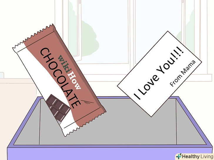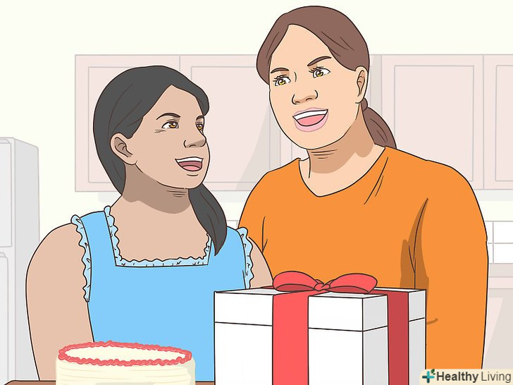 Додайте що-небудь веселе і забавне, щоб розсмішити дочку. досить з серйозними речами і моралями! Адже це має бути весела подія! Покладіть в подарункову коробочку кілька шоколадних цукерок або улюблених солодощів вашої дочки. Купіть маленьку листівку і напишіть, що ви дуже любите свою дочку, що ви завжди поруч.[4]- Якщо ви хочете, щоб це був елегантний і красивий подарунок на пам'ять, оформіть і підпишіть листівку відповідним чином. Якщо ви вирішили провести цей захід в більш повсякденному Тоні з елементом жарти, підпис в листівці повинна бути милою і забавною.