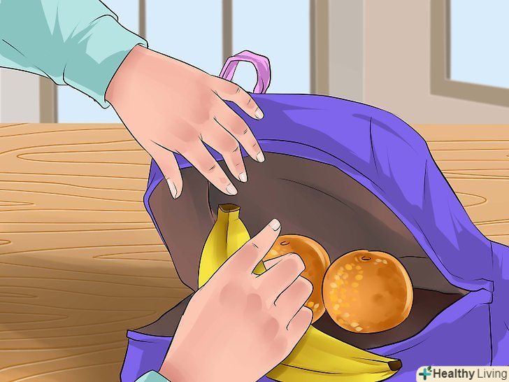 Покладіть в сумку їжу.вам напевно запропонують їжу на борту, проте найчастіше ця їжа не дуже смачна і корисна. Апельсини, банани, диня і цільнозерновий хліб допомагають полегшити симптоми менструації.[7] наріжте диню і покладіть в пластиковий контейнер або просто візьміть з собою банан або апельсин. Це продукти будуть корисніше для здоров'я, і вони допоможуть вам почувати себе краще.- Не забудьте підготувати для себе щось смачне. Під час хворобливої менструації можна побалувати себе смачним. Складіть з собою улюблені цукерки або шоколад.