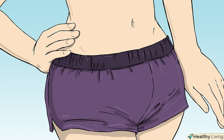 Одягайтеся в широкі шорти (не обов'язково).якщо ви дійсно переживаєте, що ниточка від тампона буде видно або просто вам не комфортно, то послабте моральну напругу, надівши широкі шорти. Купіть симпатичний фасон, який не виглядає занадто мішкуватим, і натягніть шорти поверх купальника. Для більшого спокою купите шорти темного кольору.