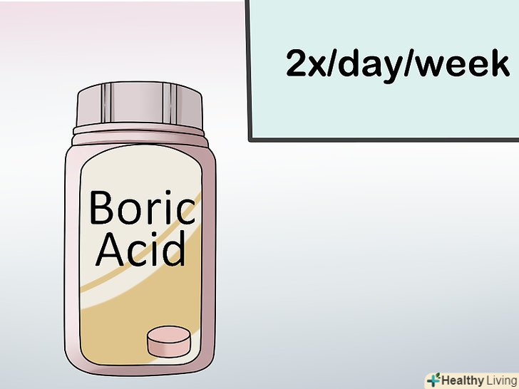 Спробуйте супозиторії з борною кислотою.борна кислота - непоганий засіб для лікування грибкових інфекцій в домашніх умовах, оскільки вона володіє протигрибковими і антисептичними властивостями. Борна кислота також дозволяє запобігти зростанню грибків. Використовувати борну кислоту краще в формі супозиторіїв, вводячи їх у піхву двічі на день протягом 1 тижня.[5]- Ні за яких обставин не наносите порошок борної кислоти на шкіру і статеві органи, оскільки він може викликати сильне роздратування. Не приймайте борну кислоту всередину, оскільки це смертельно небезпечно.