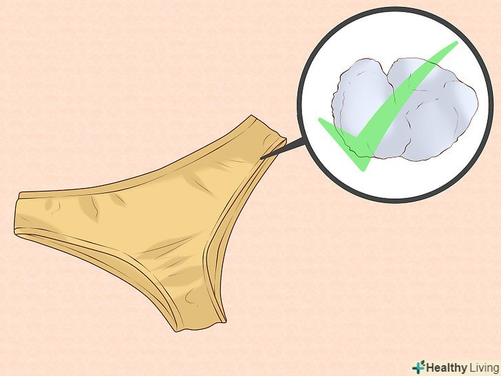 Носіть бавовняну нижню білизну.носіть нижню білизну з «дихаючих» матеріалів, таких як бавовна — це дозволить запобігти зростанню грибків і бактерій в області піхви. Не носіть нижню білизну з синтетичних матеріалів і постарайтеся не носити тісні колготки або джинси. Обов'язково негайно знімайте купальний костюм після купання, а Спортивний одяг після тренування.[14]- По можливості не надягайте нижню білизну. Наприклад, якщо ви одягнете довгу спідницю без нижньої білизни, то повітря буде вільно потрапляти в піхву, а це дозволить помітно знизити ризик розвитку інфекцій.