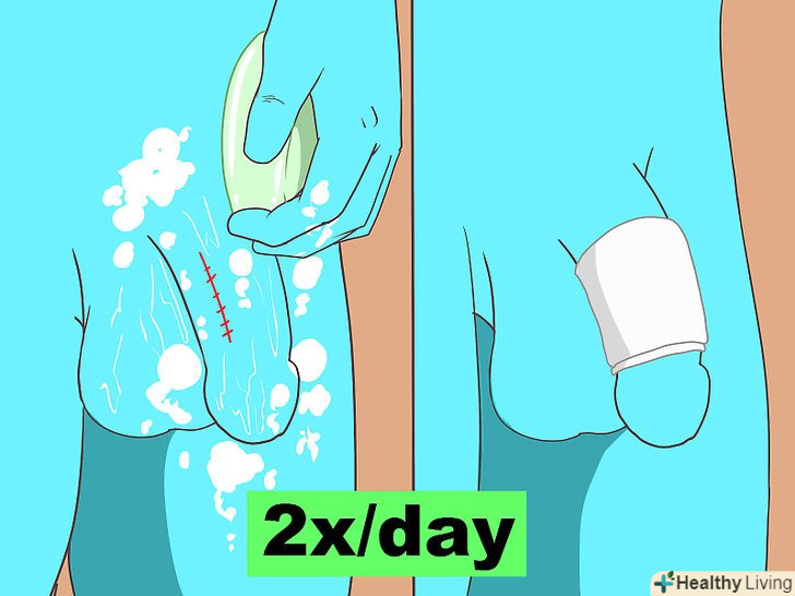 Після хірургічної процедури промивайте травмоване місце двічі на день і накладайте зверху пов'язку.після процедури строго дотримуйтесь вказівки лікаря по догляду за травмованою областю. Найімовірніше, лікар порекомендує вам мити травмоване місце теплою водою з милом двічі на день. Кожен раз після цього вам доведеться накладати чисту суху пов'язку.[13]- Не забувайте мити руки до і після обробки травмованого місця.