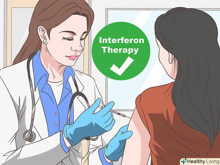 Якщо згадані методи виявляться безуспішними, обговоріть з лікарем лікування інтерфероном.якщо ви не досягнете успіху ні з яким із згаданих вище способів лікування, деякі лікарі можуть порекомендувати Вам уколи інтерферону (або іншого противірусного препарату) в уражене місце. При цьому можливі побічні ефекти, що нагадують симптоми грипу, включаючи жар, м'язові болі, озноб і больові відчуття в місці ін'єкції.[15]- Залежно від конкретного виду ін'єкцій, вам доведеться відвідувати лікаря 2-3 рази на тиждень протягом 3-8 тижнів.