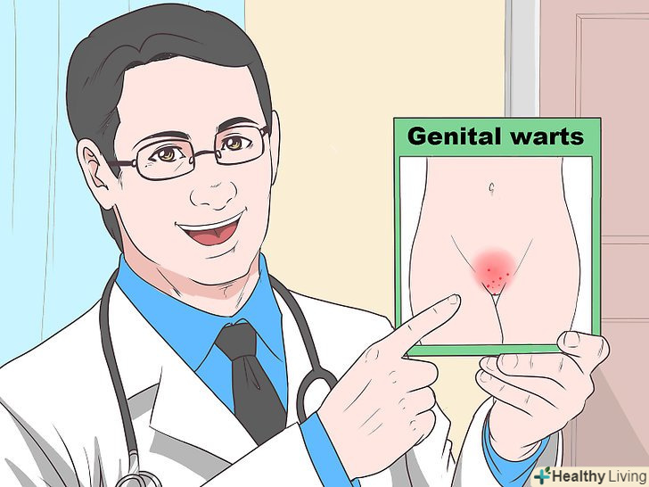 Поінформуйте сексуального партнера про те, що у вас є Генітальні бородавки.якщо вам діагностували ВПЛ, вам слід розповісти про це минулим або справжнім статевим партнерам. Неможливо дізнатися, коли ви могли заразитися ВПЛ, так як бородавки можуть з'явитися через тижні, місяці або роки після початкового контакту з вірусом. Видалення бородавок не призводить до зникнення вірусу, тому вам слід повідомляти про ВПЛ і майбутнім партнерам.[18]- Запитайте лікаря про те, який саме тип ВПЛ виявлений у вас. Існує більше сотні видів ВПЛ і кілька з них здатні призводити до раку репродуктивних органів. Розпитайте лікаря, чи існує для вас ризик розвитку раку.[19]
