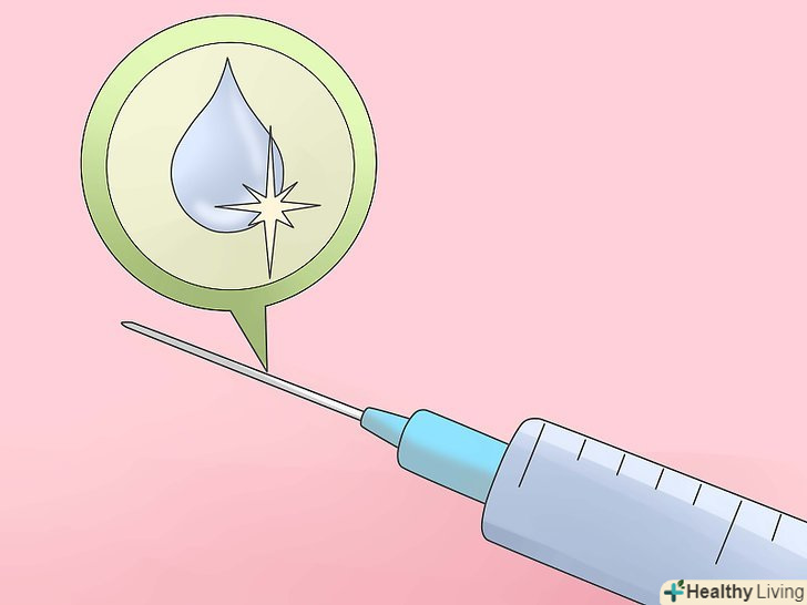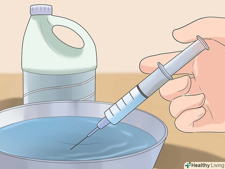Якщо у вас немає іншого виходу, обробляйте голки хлором. Ретельно дезінфікувати голки самостійно неможливо. Завжди буде ризик того, що голка виявиться зараженою. Стерилізуйте голку, якщо ви плануєте зробити ін'єкцію в будь-якому випадку і якщо ви не розраховуєте на повну безпеку.[17]- Наповніть шприц чистою водою з-під крана або бутильованою водою. Потрясіть шприц або постукайте по ньому. Зачекайте 30 секунд, а потім злийте всю воду.