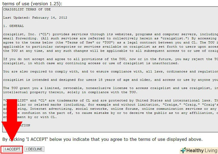 Прочитайте умови використання, щоб дізнатися правила і Політику пов'язані з розміщенням оголошень і продажем речей на Craigslist. натисніть на кнопку "Accept the terms of use", щоб погодитися з умовами і продовжуйте процес розміщення вашого оголошення.