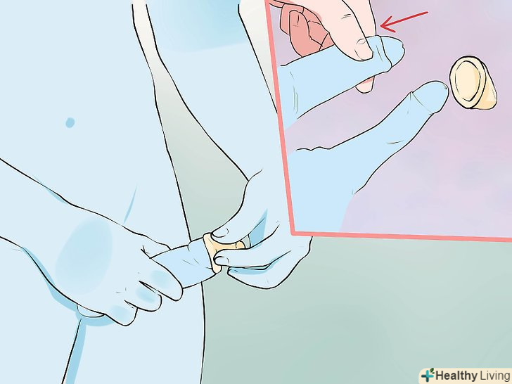 Стисніть кінчик презерватива з резервуаром для сперми.коли крайню плоть прибирають з головки пеніса, часто вона залишається на цьому місці, і вам не треба її притримувати. Як тільки крайня плоть буде зафіксована за головкою пеніса, ви звільните обидві руки, щоб почати надягати презерватив.- Перш ніж почати розгортати презерватив на пенісі, пальцями однієї руки стисніть резервуар для сперми на кінці презерватива.