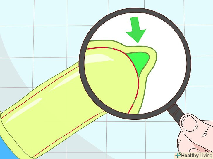 Переконайтеся, що на кінчику презерватива залишається місце для сперми.Так ви знизите ймовірність того, що сперма витече з презерватива біля основи пеніса. У багатьох презервативів на кінчику є спеціальний резервуар для сперми. Якщо такого резервуара немає, обов'язково залиште зверху трохи місця, коли будете надягати презерватив.[12]- Презерватив довше вашого пеніса? Нічого страшного, якщо він буде не до кінця розгорнутий біля основи. Якщо презерватив ідеально підходить вам по ширині, але при цьому стандартна довжина такого презерватива більше, ніж довжина вашого пеніса, просто залиште зайву частину згорнутої біля основи.[13]
