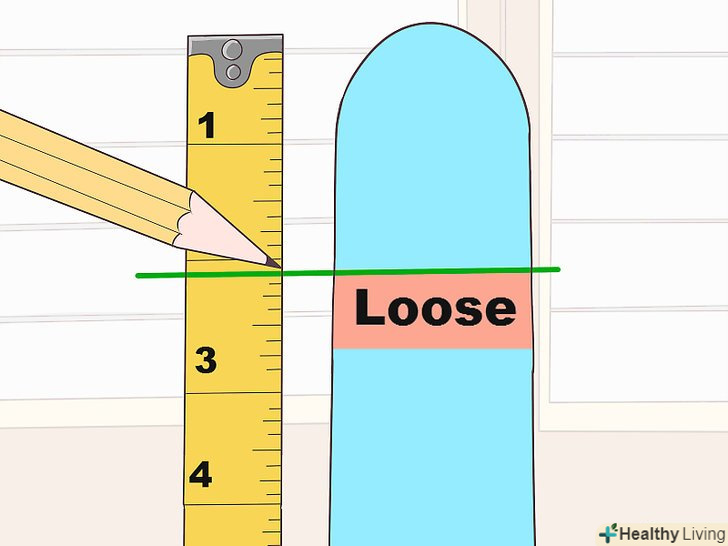 Затисніть пальцями мірну стрічку (нитку) в тому місці, де її кінець зустрівся з основною (довшою) частиною.під час вимірювання між мірною стрічкою (ниткою) і вашим пенісом не повинно бути ніяких зазорів, але при цьому також не вдавлюйте її занадто сильно в шкіру. Затисніть пальцем мірну стрічку або зробіть позначку на ній в тому місці, де її кінець зустрівся з основною частиною.[3]- Можливо, в процесі вимірювання вам захочеться залишити невеликий зазор між мірною стрічкою і пенісом, щоб результат вийшов побільше. У цьому випадку пам'ятайте ось що: ви завжди піддаєте себе і партнерів ризику, якщо розмір презерватива вам не підходить. Ніхто, крім вас, не буде знати ваш точного розміру, так що робіть все правильно.