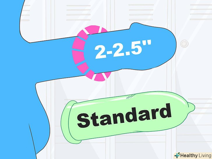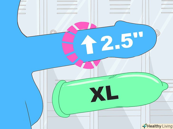 Якщо ширина вашого пеніса більше 56 мм, вам потрібні презервативи побільше.іноді такий розмір презервативів позначений маркуванням "XL"або " XXL". У цьому випадку ваш вибір в місцевих магазинах також може бути обмежений, але завжди можна знайти вироби потрібного розміру в великих аптеках і спеціалізованих онлайн-магазинах.[11]- Якщо ви вибираєте між презервативами різних виробників, не забувайте порівняти довжину свого пеніса з довжиною презерватива, зазначеної на упаковці.