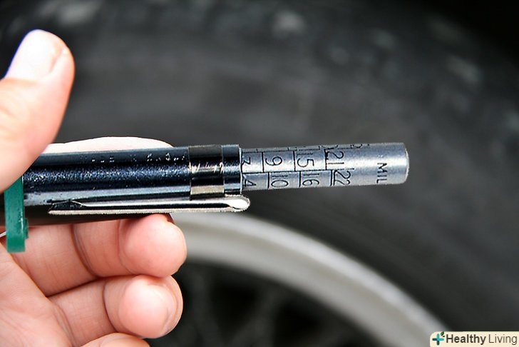 Використовуйте індикатор або прилад для вимірювання глибини малюнка протектора.Очевидно, що мало у кого є одноцентова монета із зображенням Авраама Лінкольна. Ви можете використовувати тест малюнка протектора, спеціальний індикатор або прилад для вимірювання його глибини. Якщо у вас ще немає такого приладу, його можна недорого придбати в автомагазині.- Можна завантажити тест на глибину протектора за посиланням: www.TireVan.com/facebook