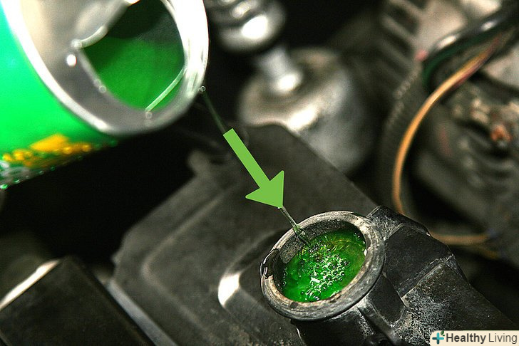 Додайте охолоджуючу рідину в міру необхідності.додайте рідину в резервуар переливу, якщо у вашому автомобілі він є; в іншому випадку додайте його до радіатора. Ви можете використовувати воронку для запобігання витоку. Як правило, антифриз слід змішувати з дистильованою водою в співвідношенні 50-50. У більш суворих кліматичних умовах ви можете використовувати 70 відсотків антифризу на 30 відсотків води, але не вище.- Не додавайте рідину, поки двигун ще теплий.