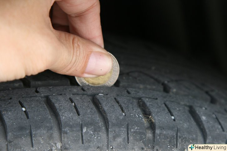 Виміряйте глибину протектора на шинах.якщо одометр вказує на пробіг в 35 тисяч кілометрів на автомобілі все ще повинні стояти оригінальні покришки, у яких глибина протектора повинна бути більше півтора міліметрів. Попросіть автомеханіка перевірити глибину протектора глибиноміром.- Ви можете виміряти глибину протектора самостійно за допомогою радянської 5-копійчаної монети. Відстань між краєм монети і верхнім краєм цифри 5 на ній – 3 міліметри. Засуньте монету в протектор і, якщо монета занурилася в нього приблизно на половину цієї відстані, то виміряна глибина приблизно півтора міліметра.