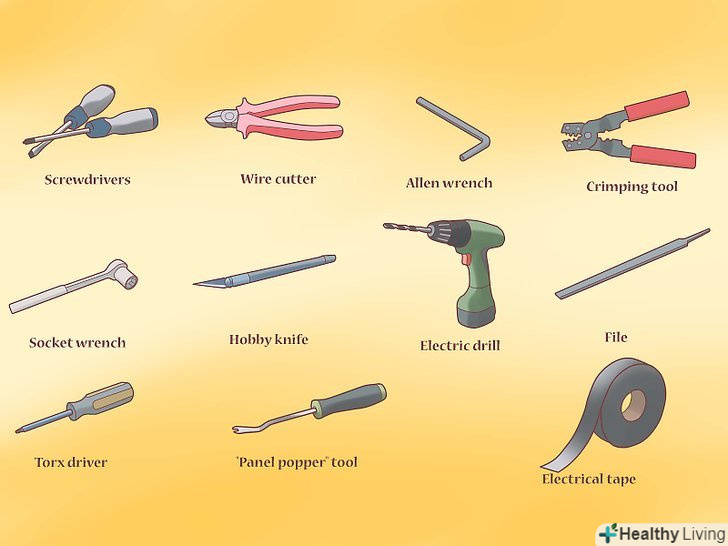 Підберіть інструмент.як зазначалося у вступі, є тисячі варіантів коли доходить справа до покупних динаміків. Тому, який-небудь список інструментів буде неповним для установки деяких динаміків, і повністю підходити для інших. Інструменти, що вам знадобляться для установки нового набору динаміків, швидше за все будуть включати в себе більшість з нижченаведених, але не обов'язково ними все і обмежиться:[1]- Набір викруток (шліцьові, Хрестові та інші);