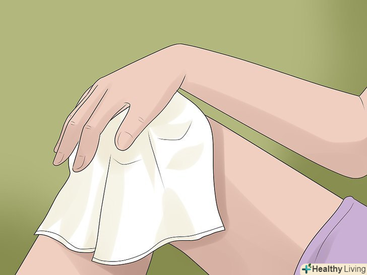 Прикладіть до коліна лід і перев'яжіть його.щоб зменшити біль і набряк, перев'яжіть коліно і прикладіть до нього лід. Візьміть пакет з льодом і прикладіть його до коліна не більше ніж на 20 хвилин. Можете повторювати цей процес щогодини. Лід допоможе запобігти подальшому пошкодженню тканин. Перев'язка коліна бинтами допоможе зменшити набряк і біль.[16]- Прикладайте лід протягом перших 48 годин після травми.