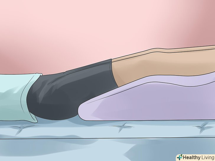 Тримайте коліно піднятим і в спокої.щоб вгамувати біль, ви повинні тримати коліно піднятим і дати йому відпочинок. Тримайте коліно вище рівня серця, щоб зменшити приплив крові до травми.[15]- Спробуйте сидіти в кріслі або на стільці, а ногу розташувати перед собою на пуфику або отоманці, підклавши під коліно пару подушок. Можете також сидіти або лежати в ліжку, також підклавши під коліно подушки.