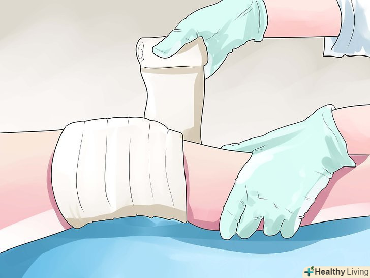 Накладіть еластичний бандаж.еластичний бандаж або бинт допоможе стимулювати кровообіг в травмованій області і забезпечить коліну підтримку. Забинтуйте коліно самостійно або попросіть лікаря.[17]
