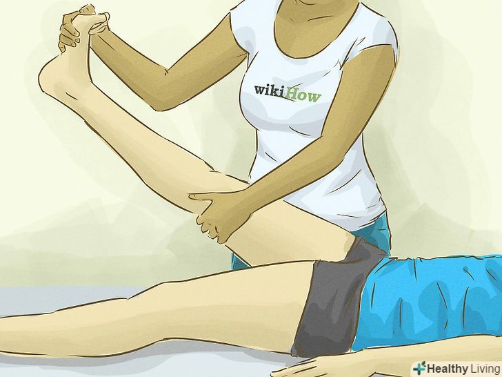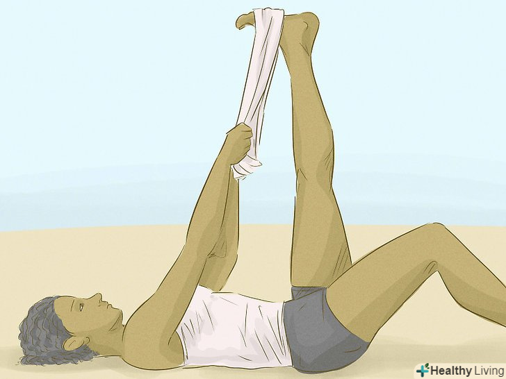 Розтяжка підколінного сухожилля.якщо ви відчуваєте судому в задній частині ноги, тоді вам необхідно розтягнути підколінне сухожилля. Існує кілька видів розтяжки підколінного сухожилля, які можуть допомогти усунути судому.- Візьміть рушник або ремінь, ляжте на підлогу і підніміть уражену судомою ногу. Оберніть пояс або рушник навколо подушечок пальців ноги, візьміться за краї рушники або пояса і акуратно почніть тягнути на себе. Потягуючи ногу, ви можете другою рукою масажувати собі підколінне сухожилля або зробити це вже після розтяжки.[3]