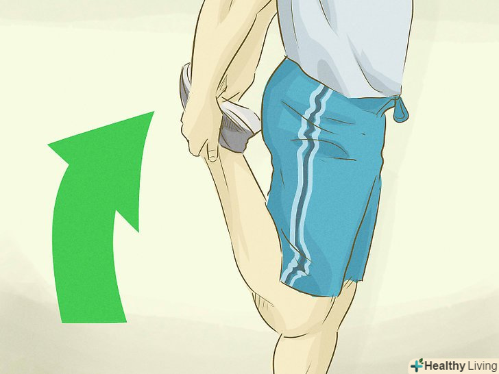 Розтяжка чотириголового м'яза.якщо ви відчуваєте судому в передній частині ноги, тоді вам необхідно зробити розтяжку чотириголового м'яза. Існує одна дуже ефективна розтяжка цього м'яза, яка допоможе усунути судому.- Щоб зробити розтяжку пошкодженої судомою квадрицепсу, необхідно встати і зігнути пошкоджену ногу в напрямку великого сідничного м'яза (до сідниць). Якщо ви можете це зробити, тоді схопитеся за ногу і потягніть її далі до сідниць для ще більш глибокої розтяжки.[5]
