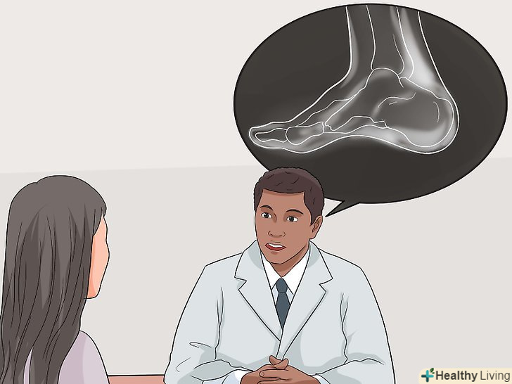 Відвідайте ортопеда.якщо ви відчуваєте постійний або гострий біль в ногах, зверніться до лікаря-ортопеда. Цей фахівець зможе визначити причини болю і усунути її, іноді і за допомогою простих хірургічних методів, хоча в більшості випадків допоможуть менш радикальні способи, такі як використання ортопедичних вставок і взуття, ортодонтичних скоб і перев'язок.[13]- Ортопед визначить, чи страждаєте ви одним з поширених захворювань, таким як підошовний фасцит, епідермофітія (грибкова інфекція) стопи, плоскостопість, деформація суглоба великого пальця ноги, бурсит цього пальця, подагра – всі ці хвороби можуть викликати більш-менш сильний біль в стопі.